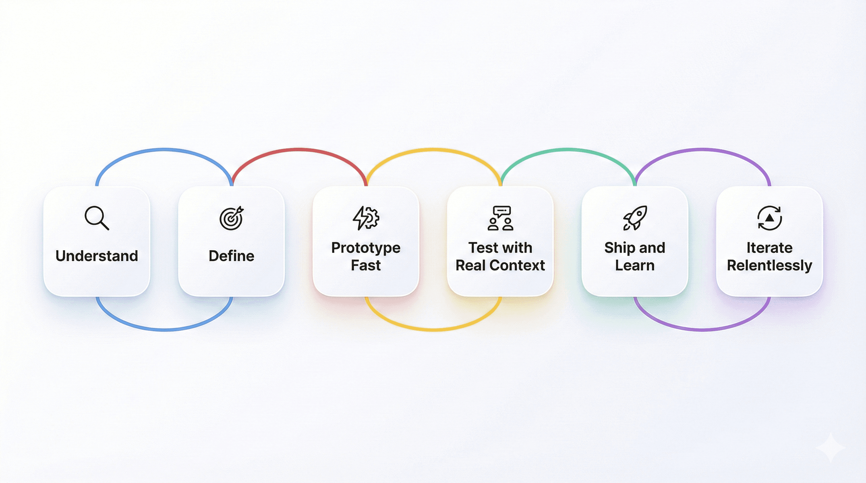 The traditional flow - research, define, ideate, prototype, test, iterate - assumed weeks of lead time between each phase. Now I can prototype a working concept in hours, test it with real users the same day, and iterate before lunch.