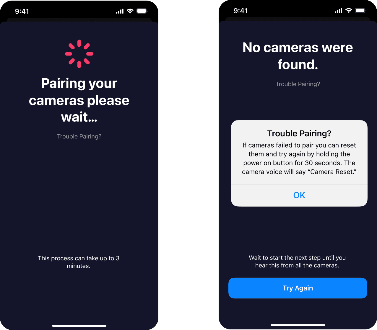 • This was a good question! When brainstorming a solution, I had thought about this. My original thought was to allow a secondary button with “Reset up Existing Cameras” However, a better solution to this could be to explain to hold in the power button for 30 seconds if they had issues pairing.