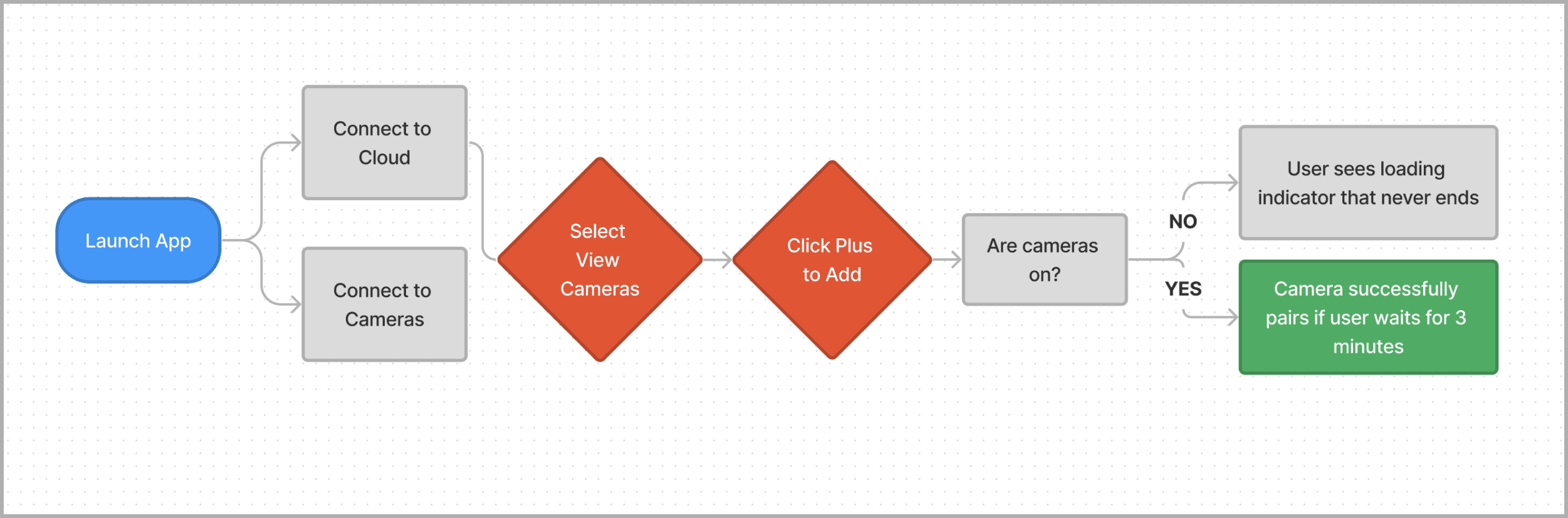 Assessing the user flow on the BlackVue mobile app helped me identify what screens, actions, and decisions a user needed to go through in order to accomplish their goal of setting up the cameras. From here, I developed a user story that would determine what the user is trying to accomplish and how they would achieve that goal in-app.